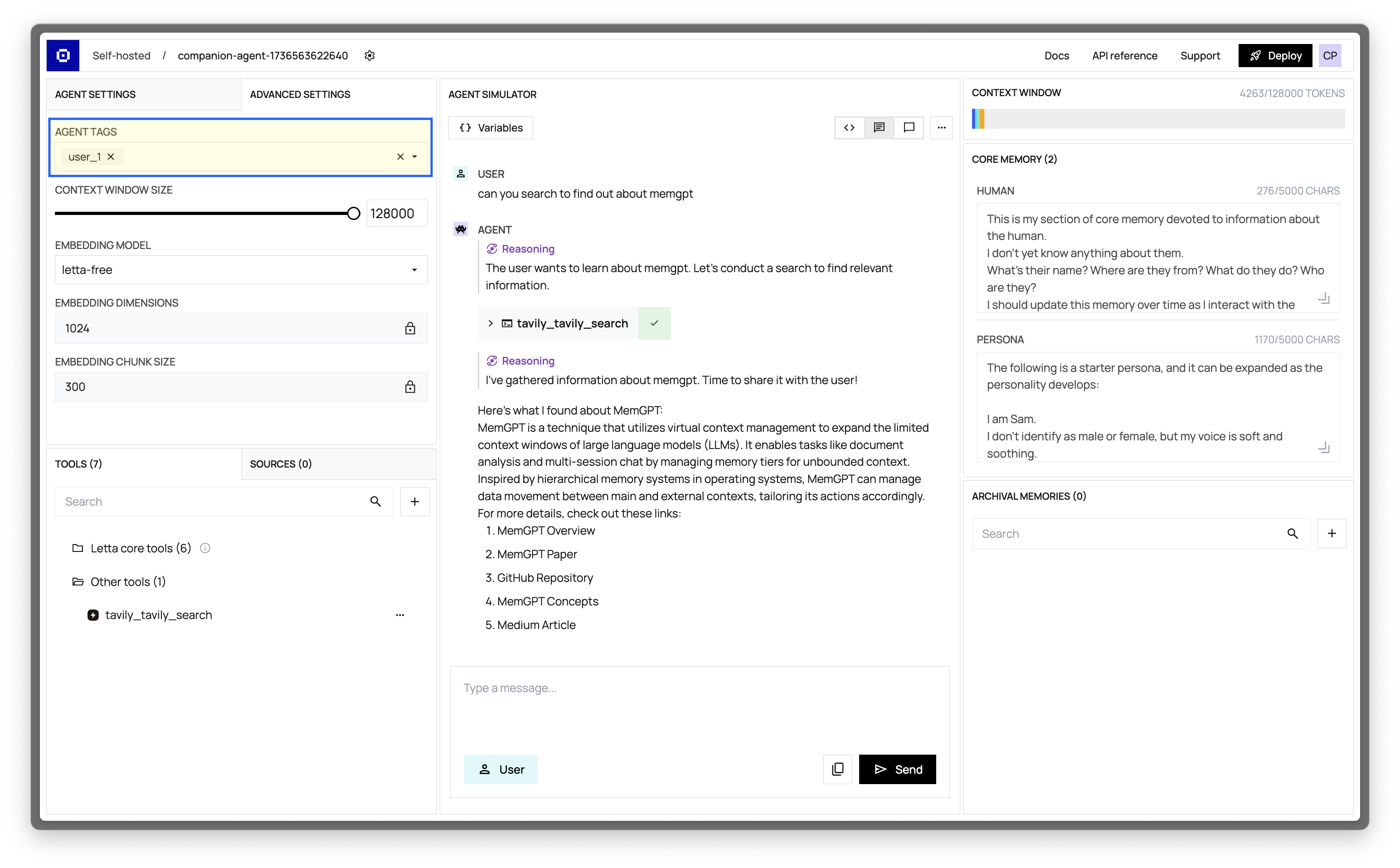 # create an agent with the user_id tagagent = client.agents.create( memory_blocks=[], model="anthropic/claude-3-5-sonnet-20241022", context_window_limit=200000, tags=[user_id])print(f"Created agent with id {agent.id}, tags {agent.tags}")