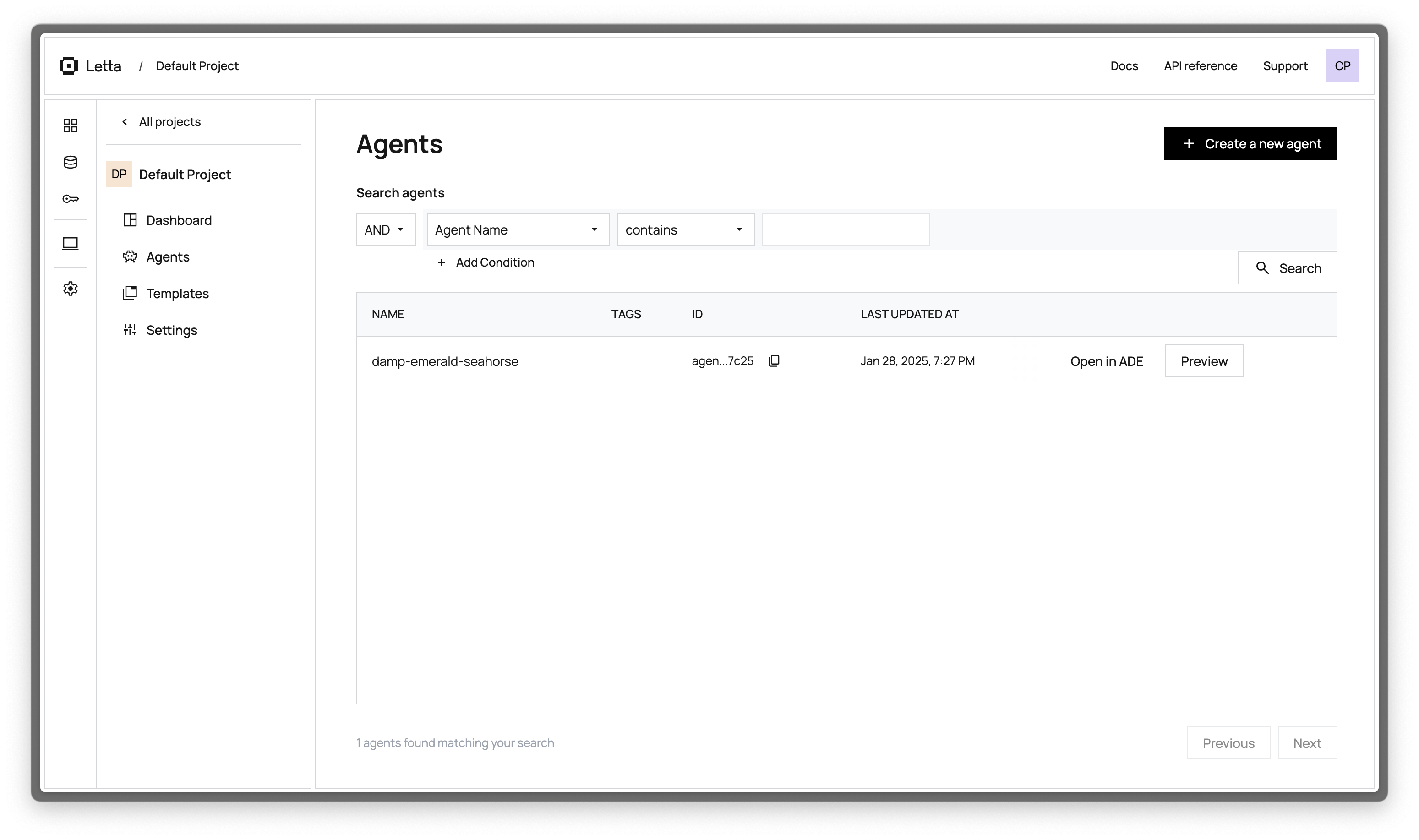 { "id": "agent-43f8e098-1021-4545-9395-446f788d7389", "name": "damp-emerald-seahorse", ...}In Letta Cloud, your workspace is organized into projects. When you create agents directly (instead of via templates), your agents will get placed in the “Default Project”. If we go into our “Default Project”, we’ll see the new agent we just created: