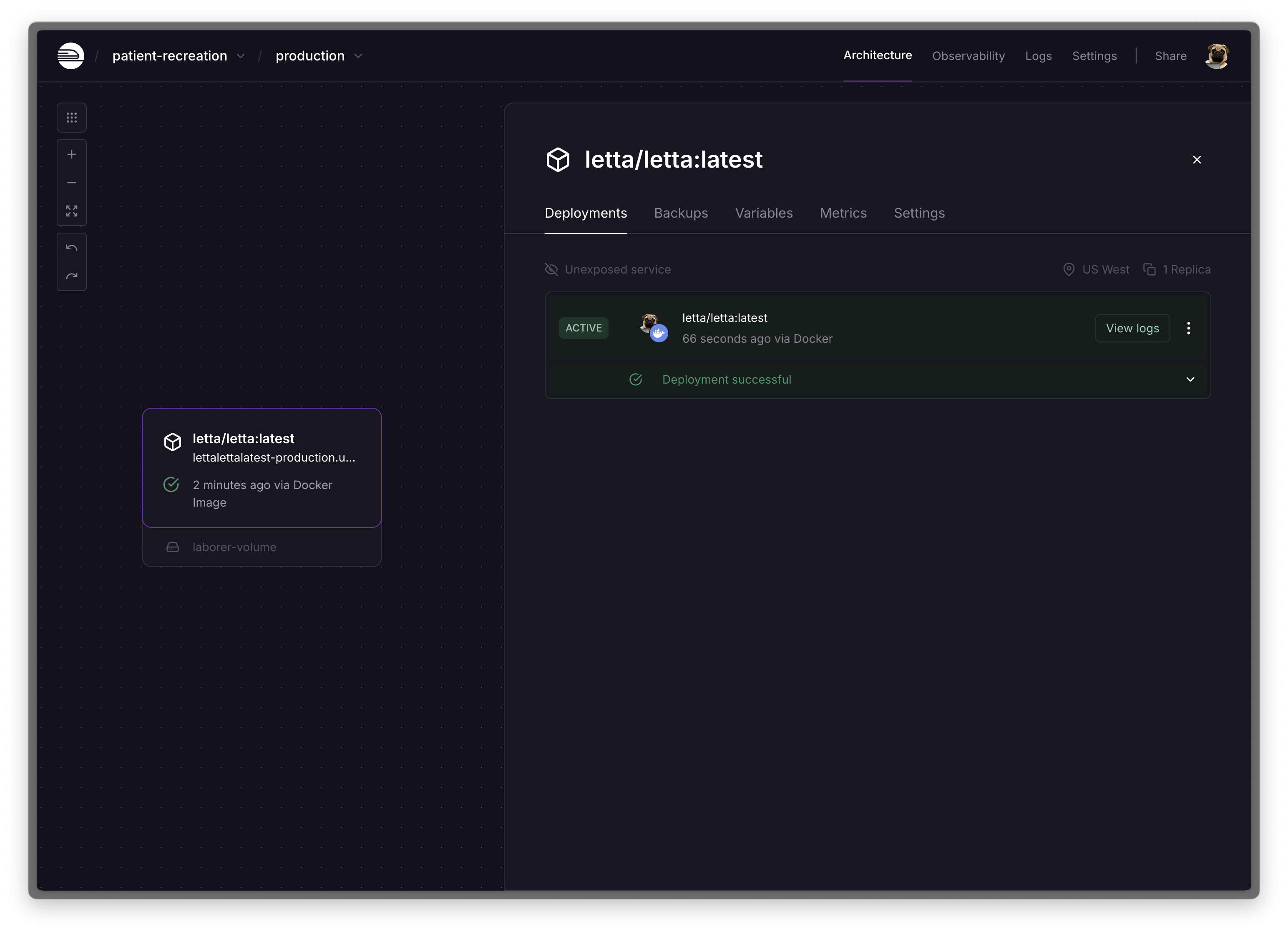Section titled “Deploying the Letta Railway template”We’ve prepared a Letta Railway template that has the necessary environment variables set and mounts a persistent volume for database storage. You can access the template by clicking the “Deploy on Railway” button below: